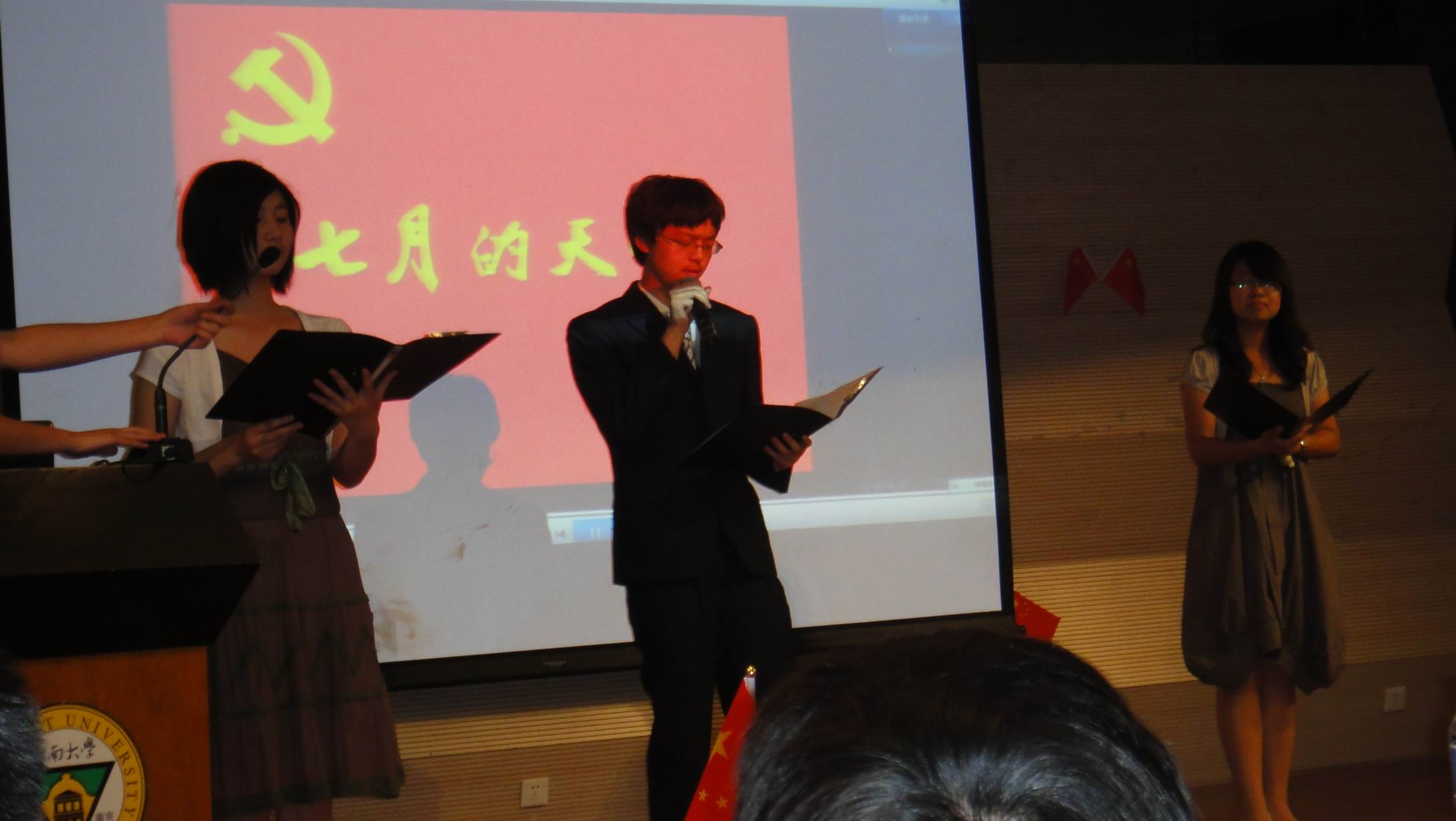 2011年5月6日晚,由太阳集团tyc33455官网党委学工部主办的庆祝建党九十周年系列活动之“朗诵经典 创作新篇”红色诗歌朗诵比赛决赛在焦廷标馆一楼圆形报告厅隆重举行。来自于各个院系的24组选手在初赛的竞争中脱颖而出,在赛场上产开激烈角逐。太阳集团官网2010级本科生崔耀丹、李蔚、陈冕三人团队,凭借《七月的天空》一诗,以磅礴的气势、深情的朗诵赢得评委和观众的一致好评,并最终获得特等奖。2010级本科生江倩雯同学则获得了红色诗歌创作的优秀奖。下图为其三人团队在比赛现场。