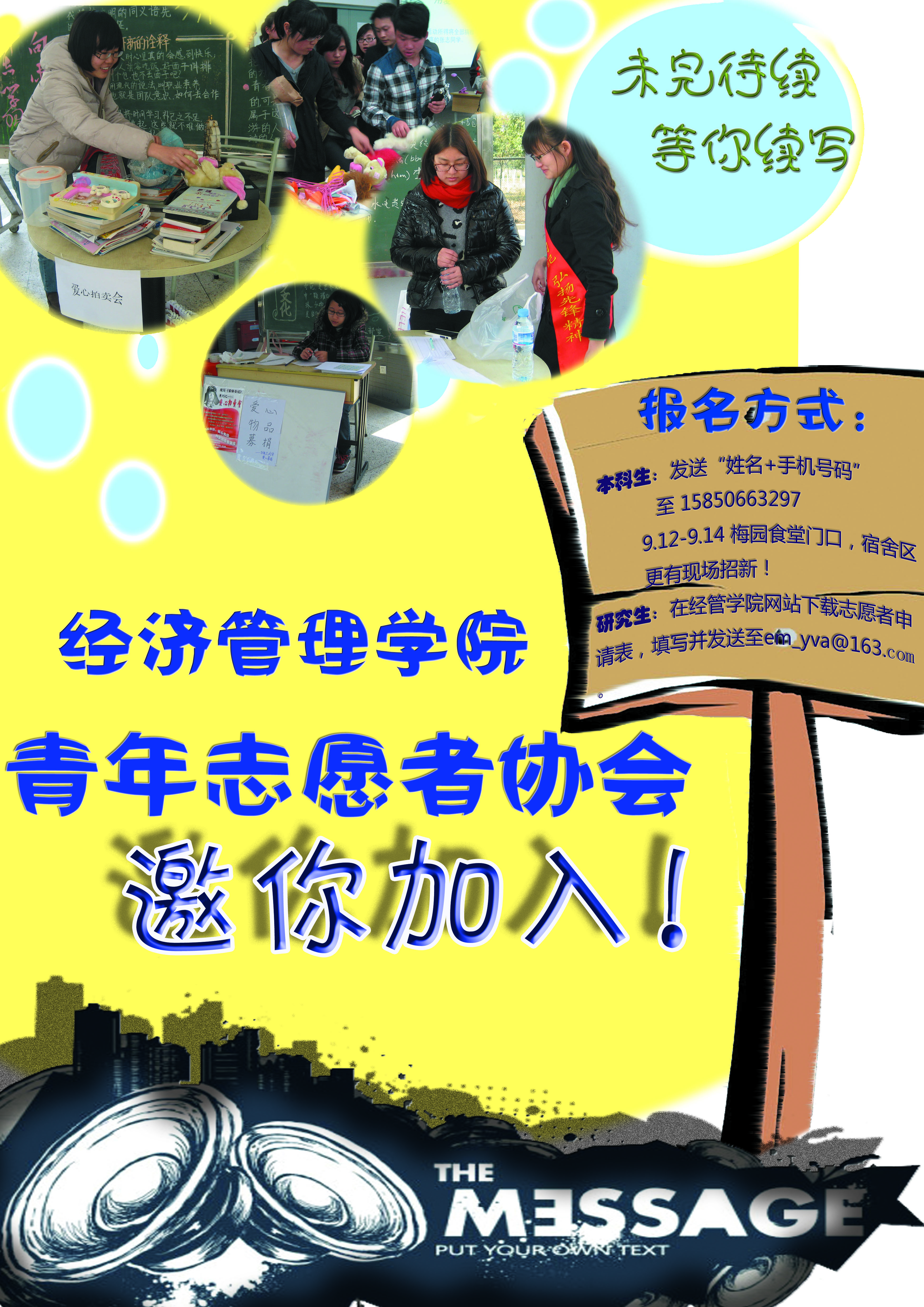 协会上一学年举办的“为西藏青年谋出路”、“关爱农民工子女”、“爱心义卖”等活动在校内外引起了强烈反响并获得一致好评。今年太阳集团tyc33455官网志愿者协会决定设立研究生分会,现面向全院研究生招募青年志愿者。具体事宜通知如下: