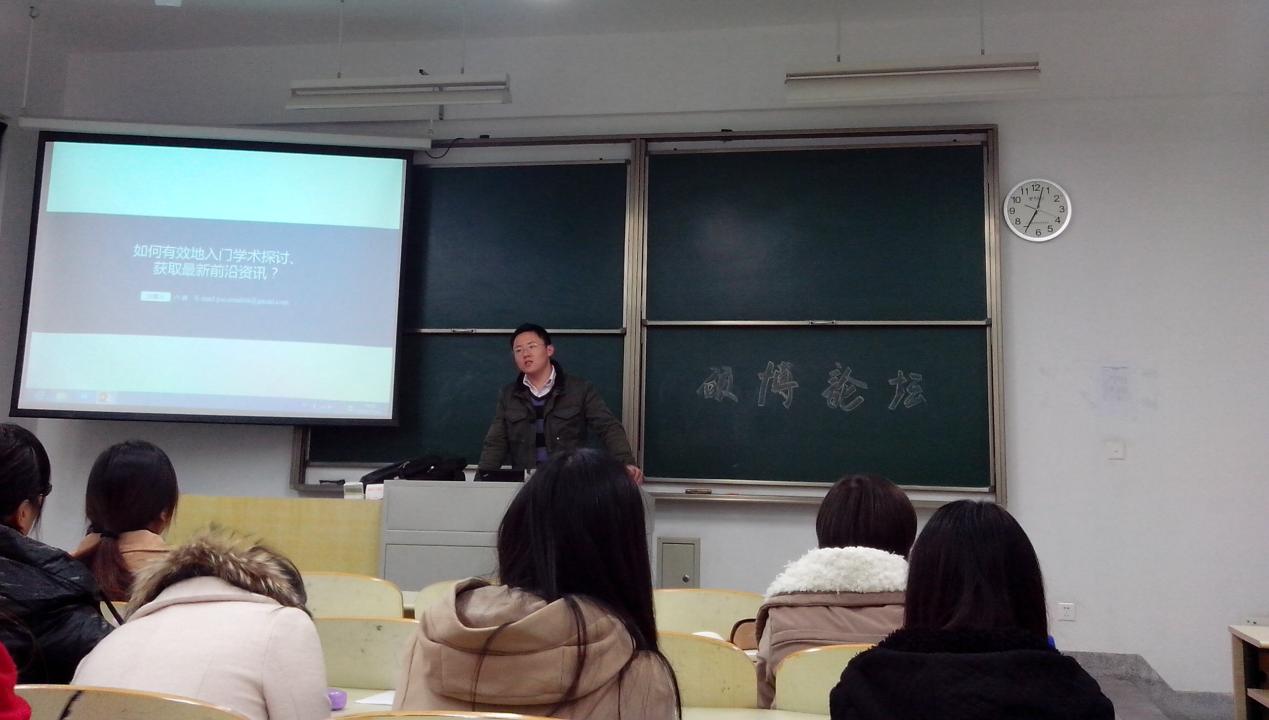 2012年10月12号周一晚七点,太阳集团tyc33455官网2012年第一届硕博论坛在纪忠楼Y301成功举办。此次论坛由太阳集团tyc33455官网研究生会学术部主办,主题为如何有效入门学术探讨、获取最新前沿资讯,邀请卢建同学作为主讲嘉宾。会上,卢建对主要的中外文学术文献及数据资源检索、整理、分析;如何同步追踪最新的学术前沿信息,并建立自己的学术图书馆;经管类常用的数据分析软件;其他学术资源来源等内容做出了详尽细致的讲解。与会人员也积极响应卢老师的演讲,很多同学一边听一边做笔记,并在演讲结束后拷取相关资源。论坛在一种融洽的氛围结束。