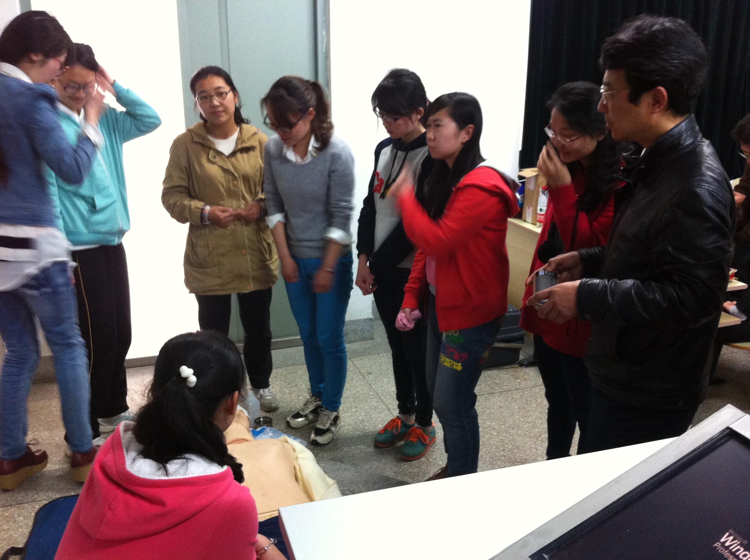 理论讲解由美国心脏病学会创设的成人心肺复苏方法切入,作为基础性扫盲,张老师配合相应的按压演示,很快把大家带入急救现场。随后详细介绍的四项基本急救技能,包括止血、包扎、骨折固定和搬运,张老师都让同学们上台,以亲历事故现场的方式一一呈现。其中,包扎环节许多同学想当然地以密集裹缠的形式对伤口进行堵塞,细心的张老师指出这种包扎方法的不合理性,可能压迫血管或引发二次感染,辅以解说和演示,张老师手把手教会了大家正确的包扎技巧。此外,张老师还根据其多年从业经验,和同学们就如何做好平日的身体保健进行了有益的分享。