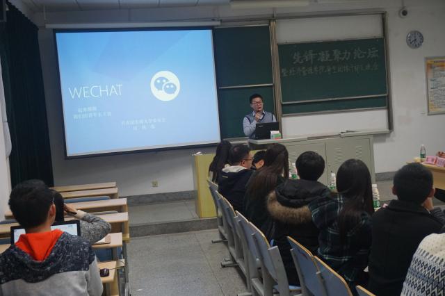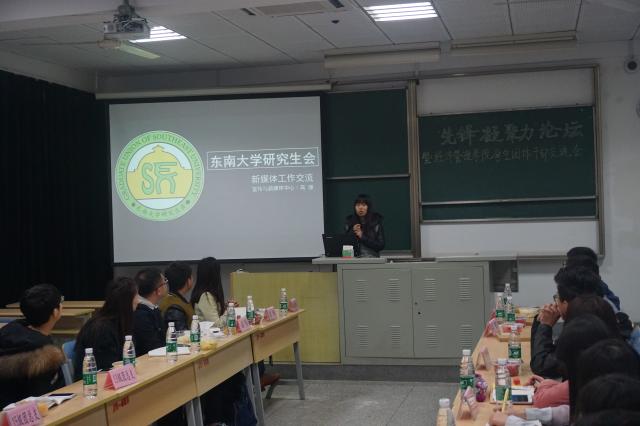 然后是来自土木学院宣传中心新闻媒体部的段斐然同学,他首先介绍了自己的经历,通过自己的经历来谈及新媒体的发展。他向大家详细地说明了土木新媒体部、纸媒体、学院活动三者之间的关系,表明有一个良好的关系链才能促进微信平台的发展。随后段斐然同学介绍了东南土木学院团委的的创新及特色,包括学院新闻、活动宣传、重要通知、原创文章和线上互动这几个环节,独到的创新和鲜明的特色才会有一个更好的平台。最后段斐然同学向大家谈了自己的心得体会:新媒体发展的速度是超乎大家想象的,希望大家能抓住这个发展的机会,积极向其他优秀的公众号学习,不断改进发展自己的公众平台。