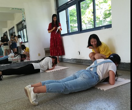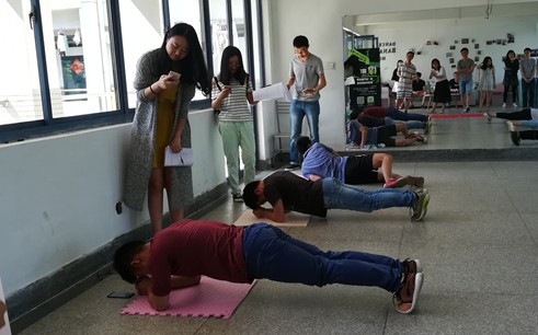 相对于男子组,女子组比赛氛围轻松多,大家相互鼓励。有位正在进行平板支撑同学满脸通红的吼道:“为了奶昔,为了周黑鸭,拼了”,大家听到后立刻笑了,顿时打破了紧张的比赛气氛。在这一环节中,不仅有欢声笑语,而且有坚持和汗水!