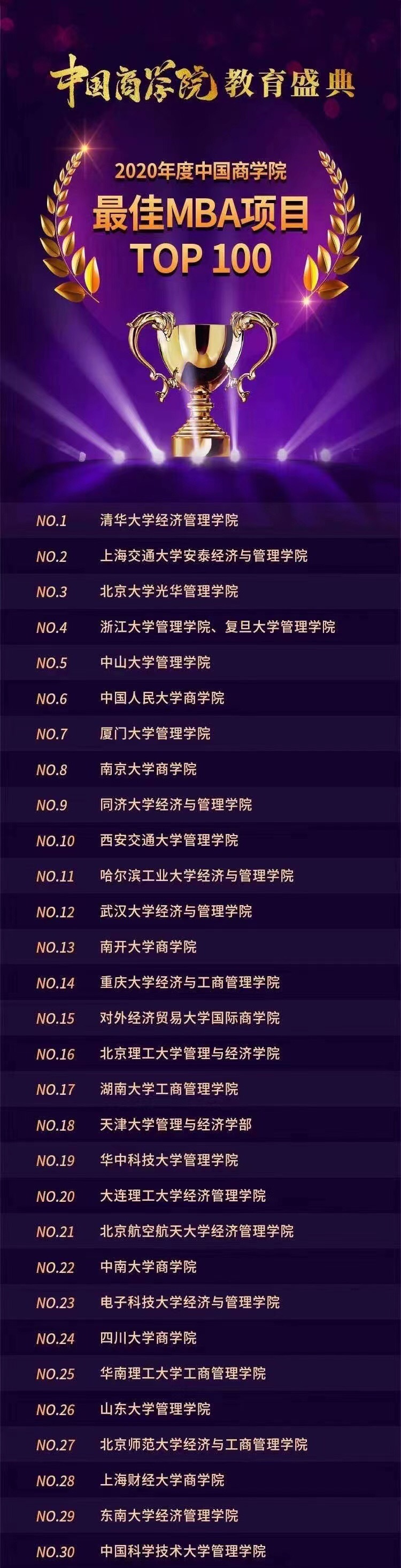 2020年12月23日,MBAChina与《经理人》杂志联合主办的2020年中国商学院教育盛典在京顺利召开。教育部高教司原司长、中国高教学会副会长张大良先生应邀出席盛典并致辞,湖南工商大学校长陈晓红院士发表了主旨演讲。作为本次年度盛典的重头戏,2020年度中国商学院“最佳MBA项目TOP100”排行榜闪耀发布。太阳集团tyc33455官网MBA项目入榜“2020年度中国商学院最佳MBA项目TOP100”第29名,另获得“2020年度中国商学院最佳金融MBA项目TOP10”和“2020年度中国商学院校友组织卓越领导奖”两项殊荣。