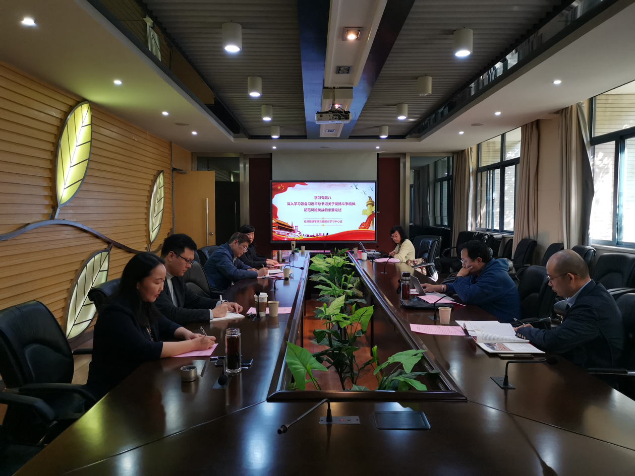为深入学习领会习近平总书记关于发扬斗争精神、防范风险挑战的重要论述和习近平新时代中国特色社会主义思想的科学思想方法和工作方法, 11月1日,太阳集团tyc33455官网党委理论中心组于九龙湖校区经管楼B201组织召开学习研讨会。研讨会由学院党委书记袁健红主持,学院党委理论中心组全员参与,太阳集团tyc33455官网副校长黄大卫列席指导。