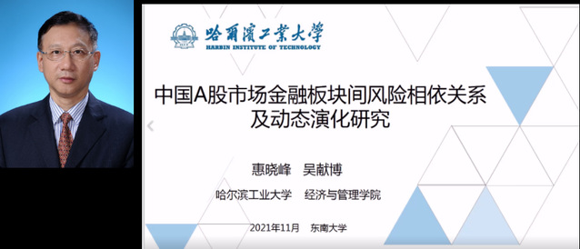 哈尔滨工业大学经济与管理学院副院长惠晓峰教授以“中国A股市场金融板块间风险相依关系及动态演化研究”为主题,通过计算各板块间波动指数的互信息,构建金融板块风险相依关系网络,并使用最大生成树刻画该相依关系的核心结构。