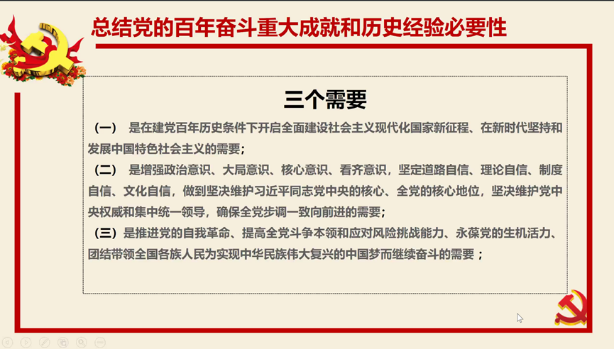 刘晓星老师首先介绍了党的十九届六中全会的概况,带领大家回顾了党的百年奋斗历程。在漫长的奋斗历程中,我党总能在关键时刻总结经验,汲取前进的智慧和力量。因此,作为新时代的大学生党员,学习总结党的百年奋斗重大成就和历史经验十分必要。