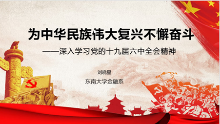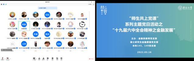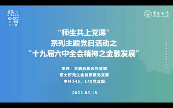 党的十九届六中全会是在党百年华诞的重要时刻,“两个一百年”奋斗目标历史交汇关键节点上召开的一次重要会议。为了让支部同学更深入地学习和领会党的十九届六中全会精神,并结合自身专业知识学以致用, 2022年3月16日中午,太阳集团tyc33455官网金融系教师党支部、硕士研究生金融厚德党支部、本科145和本科149党支部共同举办了“师生共上党课”系列主题党日活动第二场——“党的十九届六中全会精神之金融发展”。