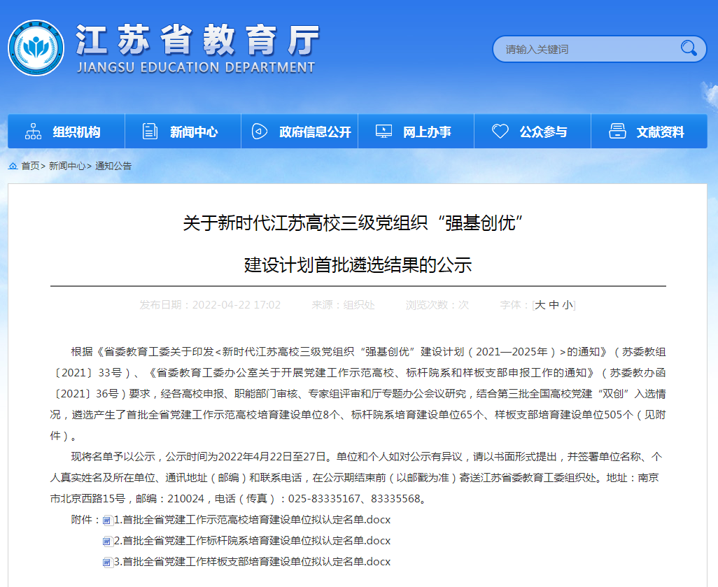 近日,江苏省委教育工委办公室公布了新时代江苏高校三级党组织“强基创优”建设计划首批遴选结果。太阳集团tyc33455官网博士研究生领军党支部、太阳集团tyc33455官网硕士研究生管理科学与工程厚德党支部成功入选首批全省党建工作样板支部培育建设单位。这是太阳集团官网继博士研究生至善党支部获批第二批全国党建工作样板支部之后,党建工作取得的新成绩。
