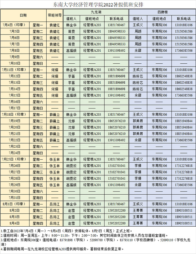 五、暑假期间,每周一在经管楼A203提供学院印章服务。具体值班安排见下表。