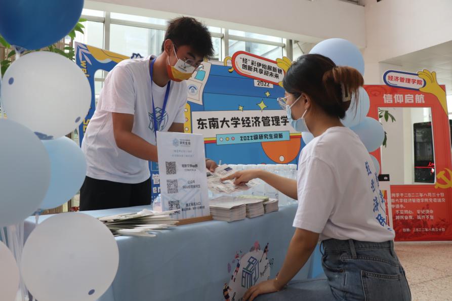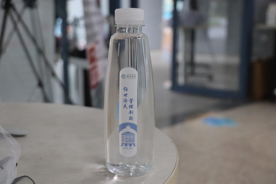 学院研究生会为新生们定制了小圆扇和印有经管学院价值观“经世济民,管理制衡”的矿泉水,象牙白与院徽蓝交相辉映,成为迎新颇具设计感的“热门单品”。