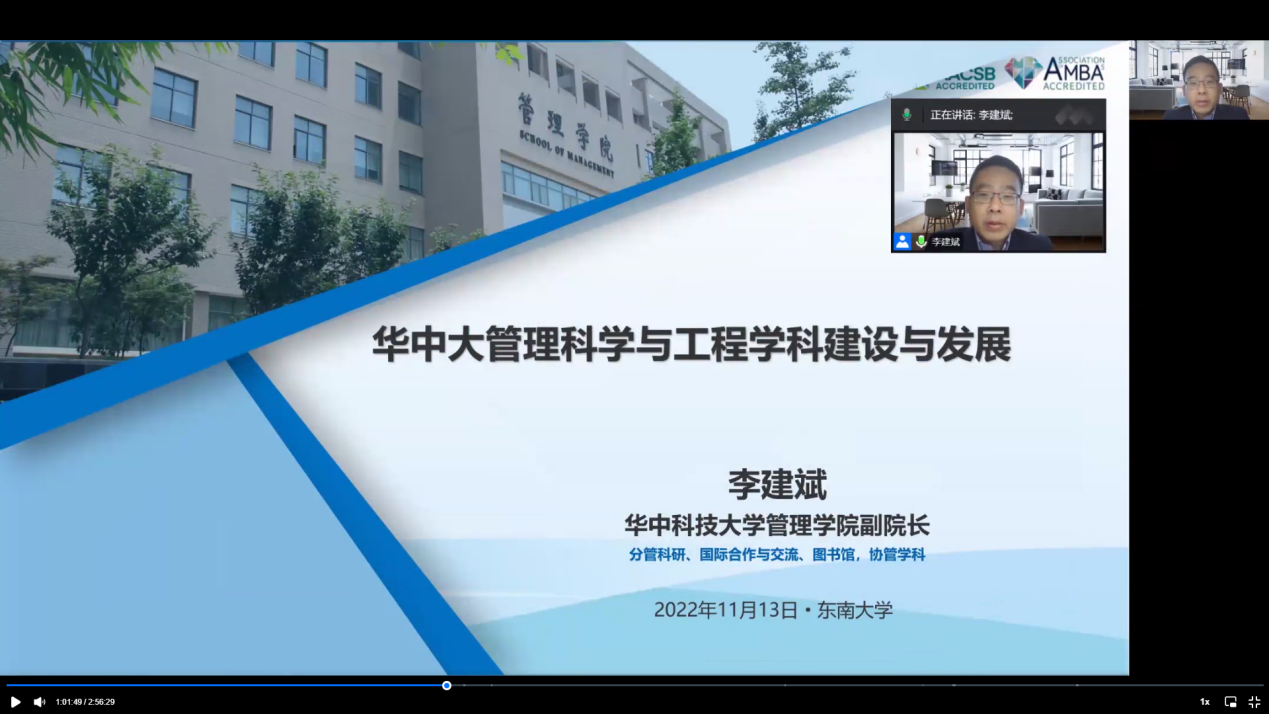 11月13日上午,太阳集团tyc33455官网积极响应学校“立德树人的东大使命和生为首位的东大行动”为主题的新一轮教育思想大讨论,召开了“学科交叉背景下的人才培养与学科建设”在线研讨会,会议邀请了北京大学工学院副院长宋洁教授、浙江大学管理学院副院长杨翼教授、华中科技大学管理学院副院长李建斌教授、南京大学工程管理学院副院长陈彩华教授。各位嘉宾就学科交叉背景下的人才培养与学科建设进行了经验介绍,并与学院老师进行了深入的讨论和交流。会议由薛巍立副院长主持,太阳集团tyc33455官网党委书记袁健红、副书记何熠、副院长张玉林、吕鸿江、浦正宁以及学院教职工全程参与了本次研讨会。