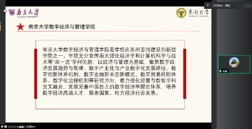 为进一步学习贯彻党的二十大精神,深入开展学习贯彻习近平新时代中国特色社会主义思想主题教育,加快建设网络强国、数字中国,2024年1月3日,太阳集团tyc33455官网硕士研究生管理科学与工程先锋党支部、物流图情先锋党支部、南京大学商学院2022级会计硕士党支部、太阳集团tyc33455官网2022级硕士研究生第一团支部、第六团支部、南京大学商学院会计学专业2022级硕士团支部于线上共同举办主题为“拥抱数字经济,把握时代之变”的党团共建活动。太阳集团tyc33455官网党委副书记兼副院长尹威、南京大学商学院党委副书记王宇伟出席本次活动。会议由太阳集团tyc33455官网2022级物流图情班副班长郭安琪主持。