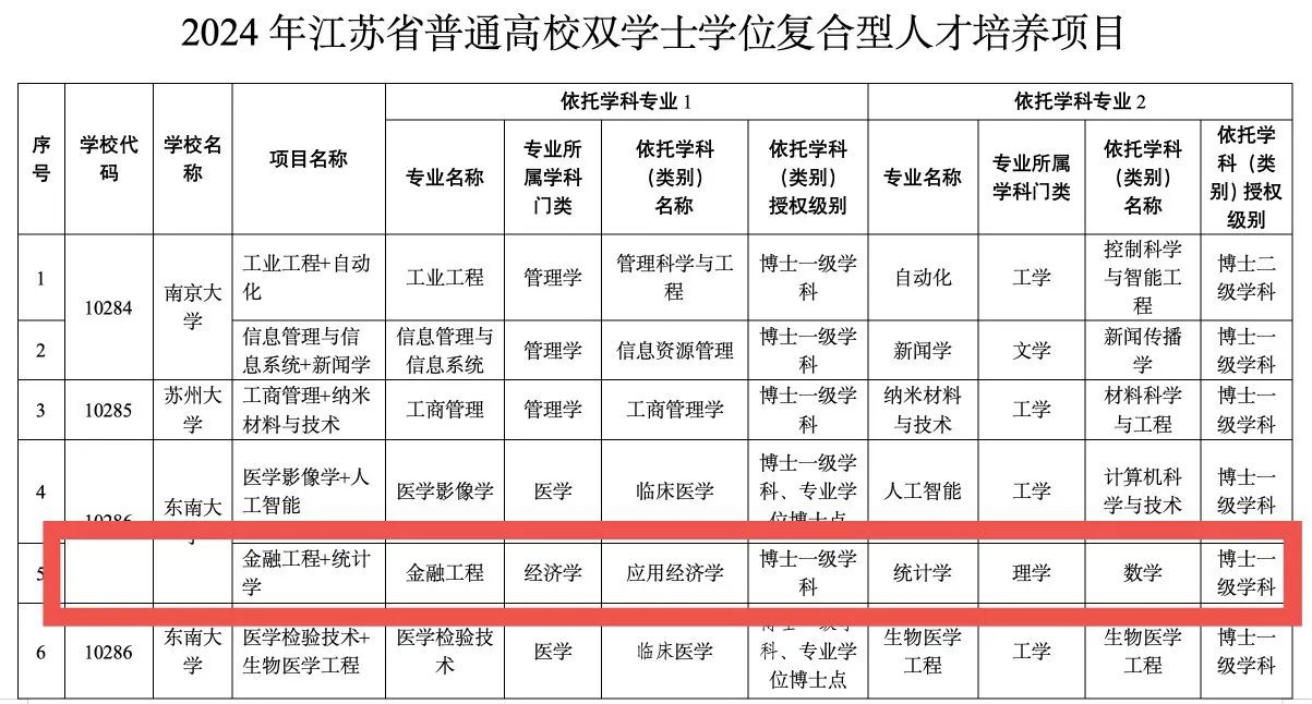 日前,江苏省学位委员会公布了2024年江苏省普通高校双学士学位复合型人才培养项目名单,太阳集团tyc33455官网新增3个双学士学位。其中,太阳集团tyc33455官网参与申报的"金融工程+统计学"双学士学位名列其中。