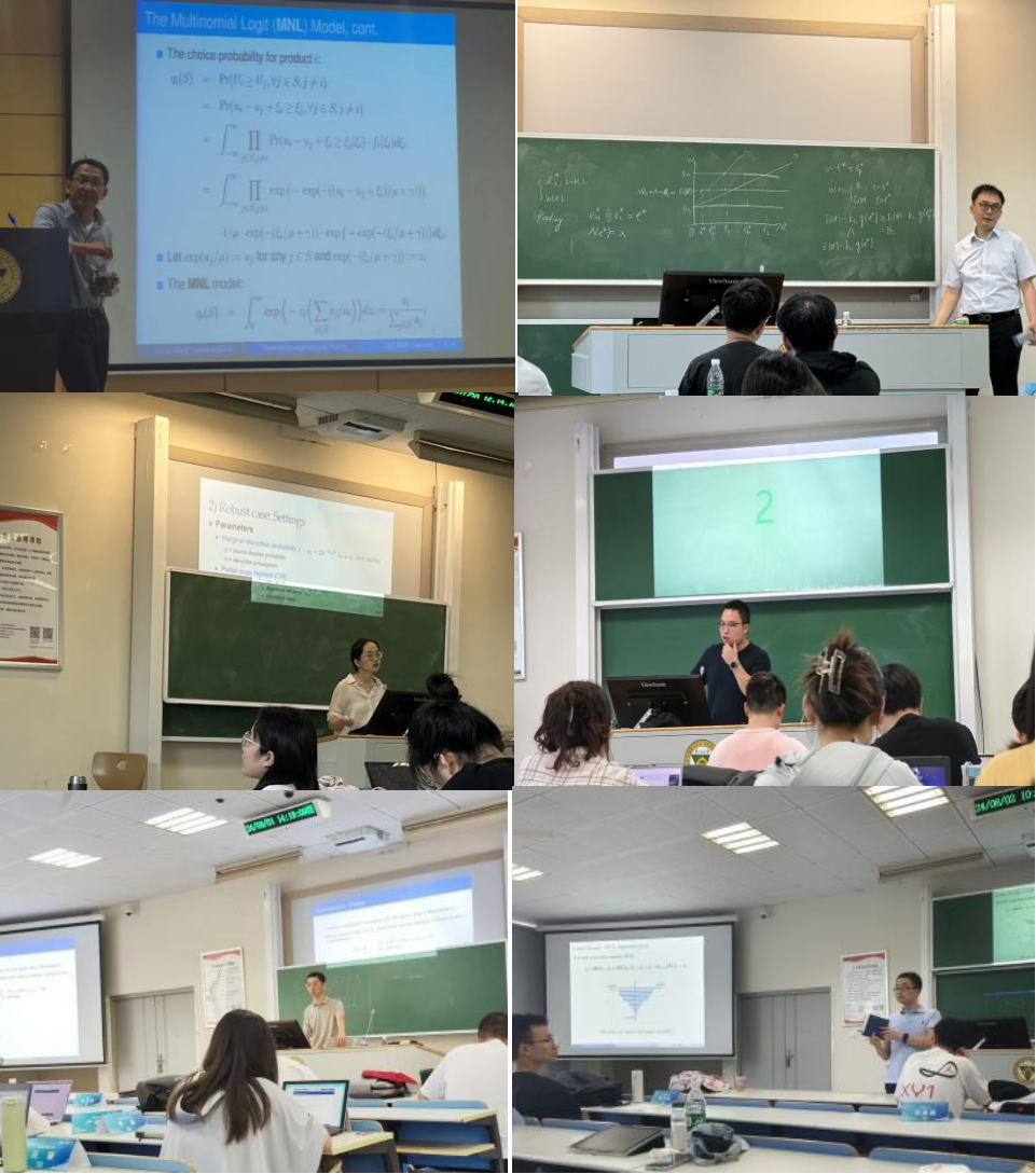 本次暑期学校共有六位知名学者担任授课教师。约翰霍普金斯大学王汝现教授以“收益管理与定价”为主题,深入探讨了收益管理的理论与实践。香港理工大学姜力教授系统地讲解了供应链管理中的博弈论研究方法、案例分析和理论应用。太阳集团tyc33455官网李泳臻副教授介绍了了鲁棒优化的基本概念和应用。香港中文大学陈植教授则以“分布鲁棒优化在运营管理中的应用”为主题,深入浅出地讲解了鲁棒优化的理论体系并详细讨论了其在运营管理中的多种应用场景。新加坡科技研究局林云辉研究员介绍了选址问题在物流和供应链管理中的应用。香港理工大学潘凯教授则以“分布鲁棒优化的降维方法”为题,与同学们探讨了在分布鲁棒优化中如何通过降维技术提高优化效率。