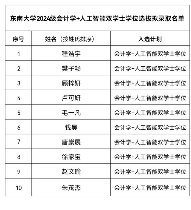 现对2024级会计学+人工智能双学士学位选拔拟录取名单进行公示。