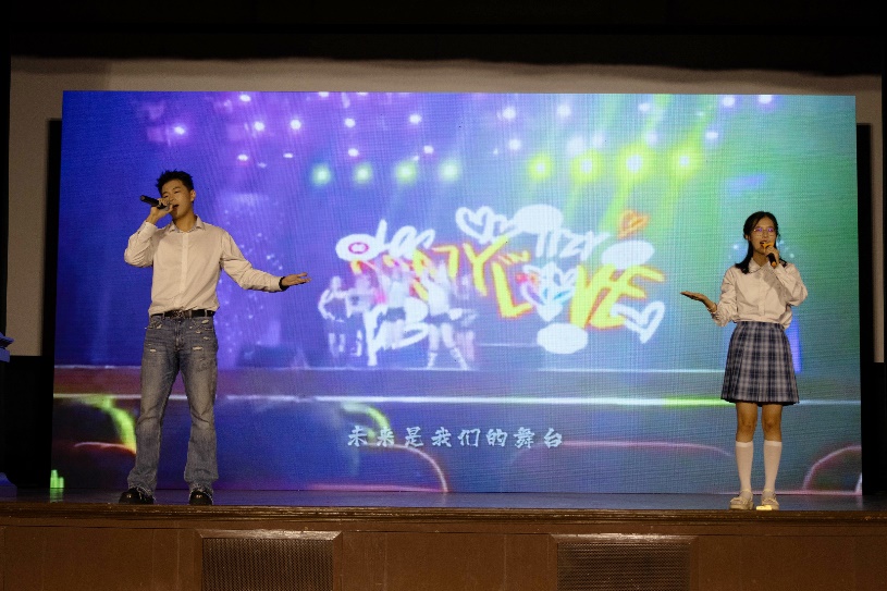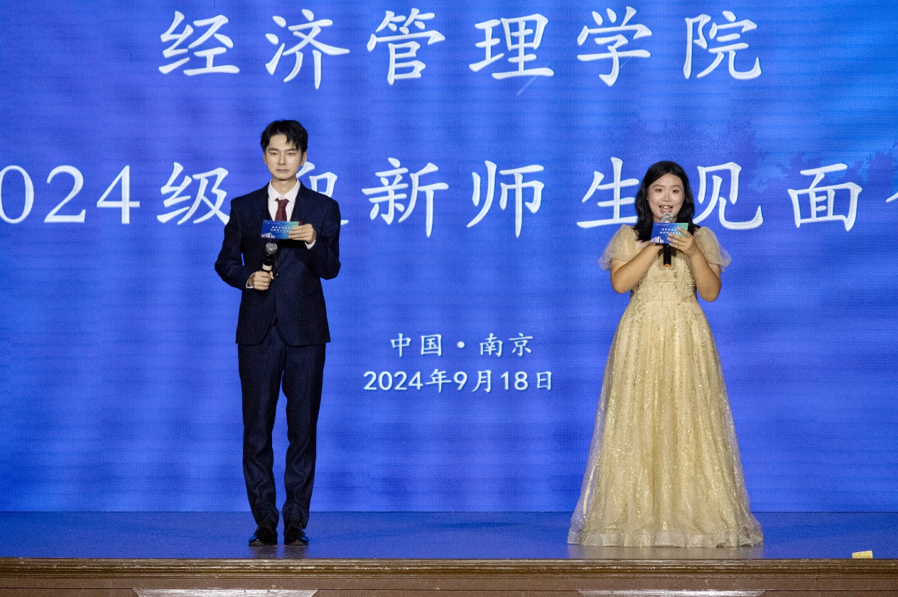 在歌曲《逐梦经管人》旋律中,2024级新生见面会进入高潮。研究生周家葆与本科生张皓玥带来的深情演绎,激发了在场每一位经管学子的自豪感与使命感。
