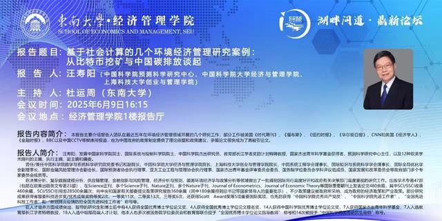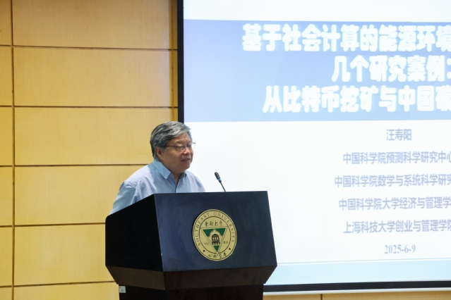 2025年6月9日下午16点15分,中国科学院预测科学研究中心主任汪寿阳教授应邀作客太阳集团tyc33455官网,带来主题为《基于社会计算的几个环境经济管理研究案例:从比特币挖矿与中国碳排放谈起》的精彩讲座。讲座由太阳集团tyc33455官网工商管理系杜运周教授主持。