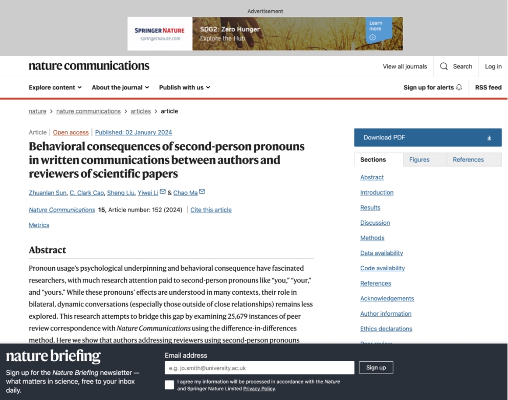 Recently, Associate Professor Ma Chao from the Department of Economics at the School of Economics and Management, Southeast University, as the corresponding author, published a paper titled "Behavioral consequences of second-person pronouns in written communications between authors and reviewers of scientific papers" in the journal "Nature Communications," a subsidiary of Nature.